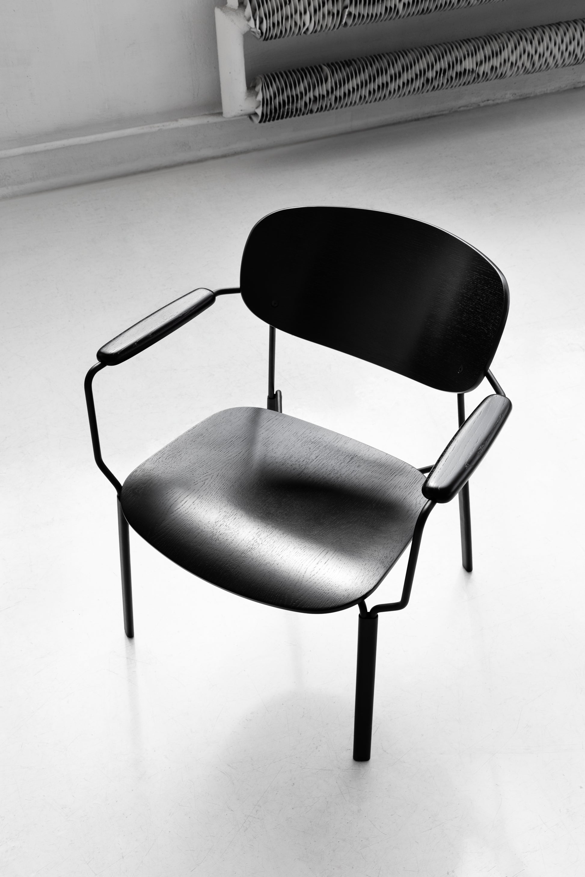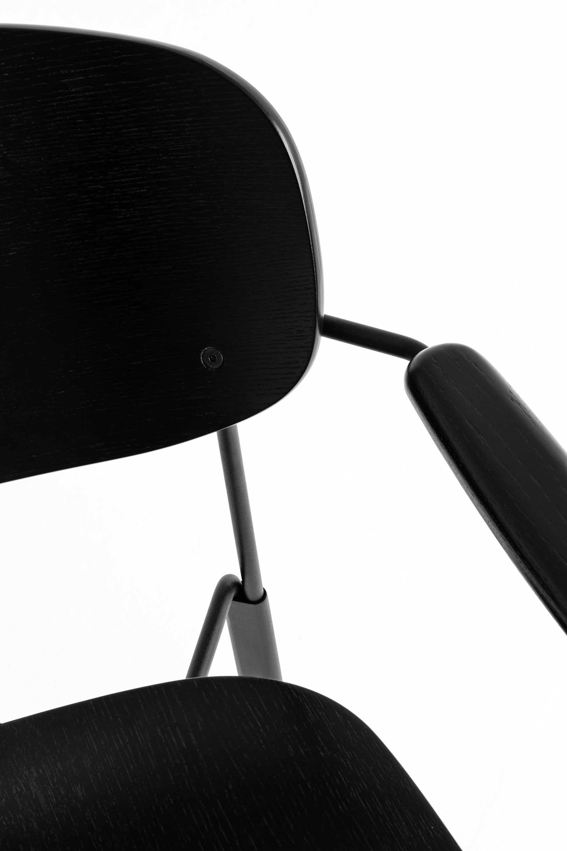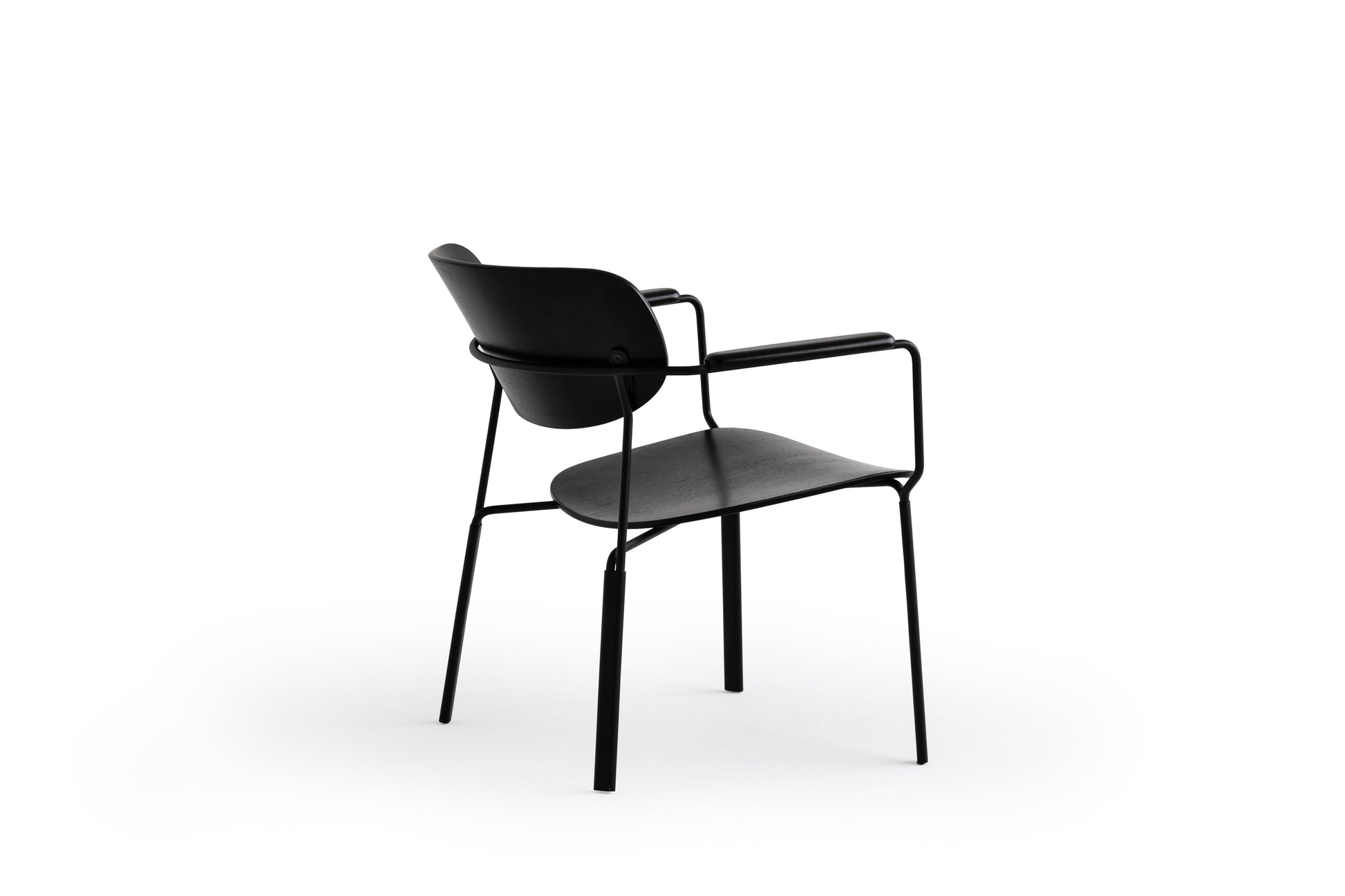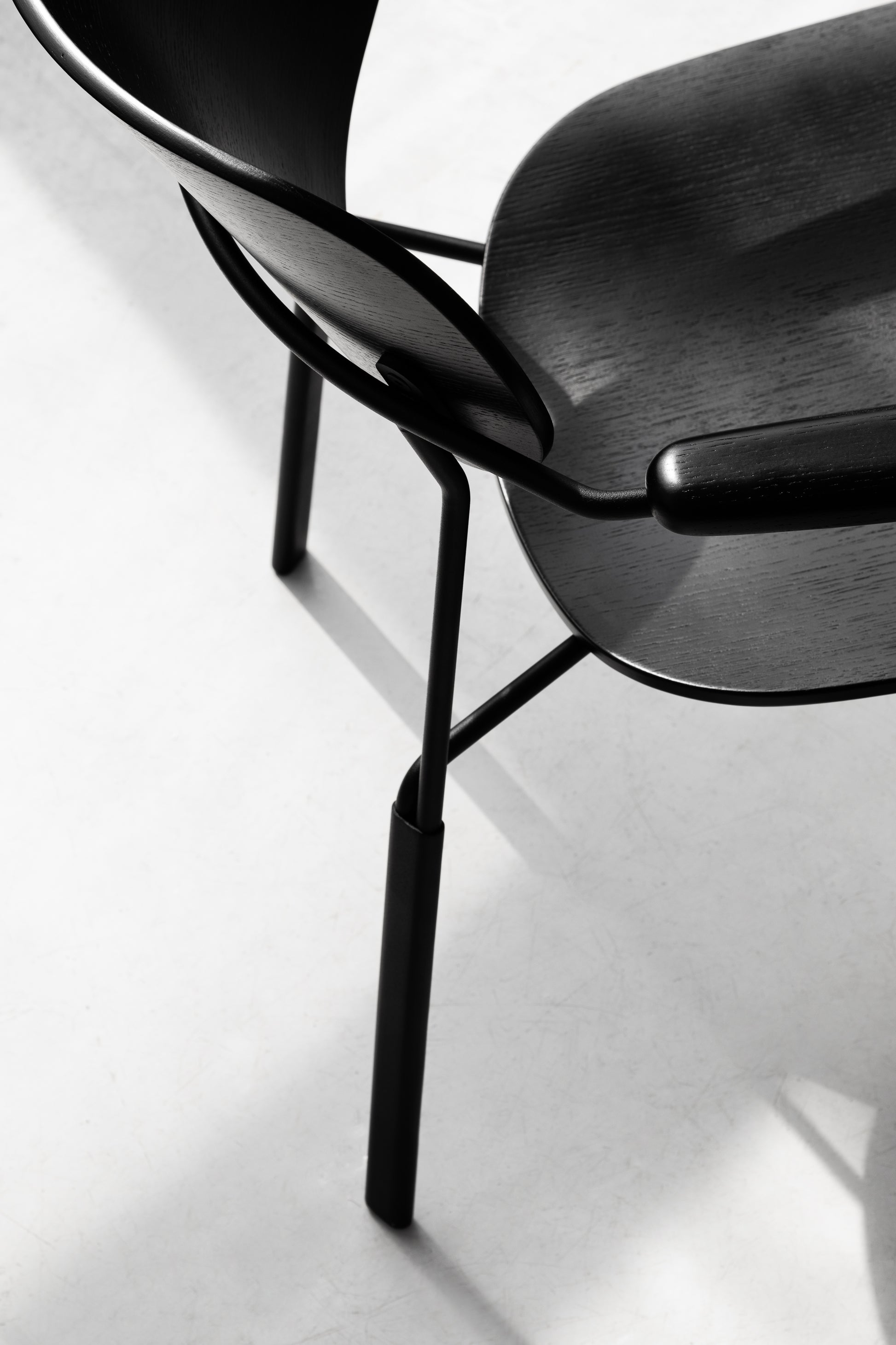 Die geschwungene Sitzschale, die integrierten Armlehnen und das feine Metallgestell ergeben zusammen einen Stuhl,