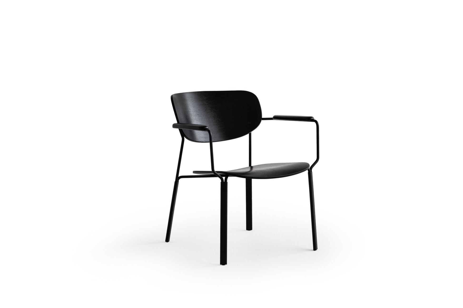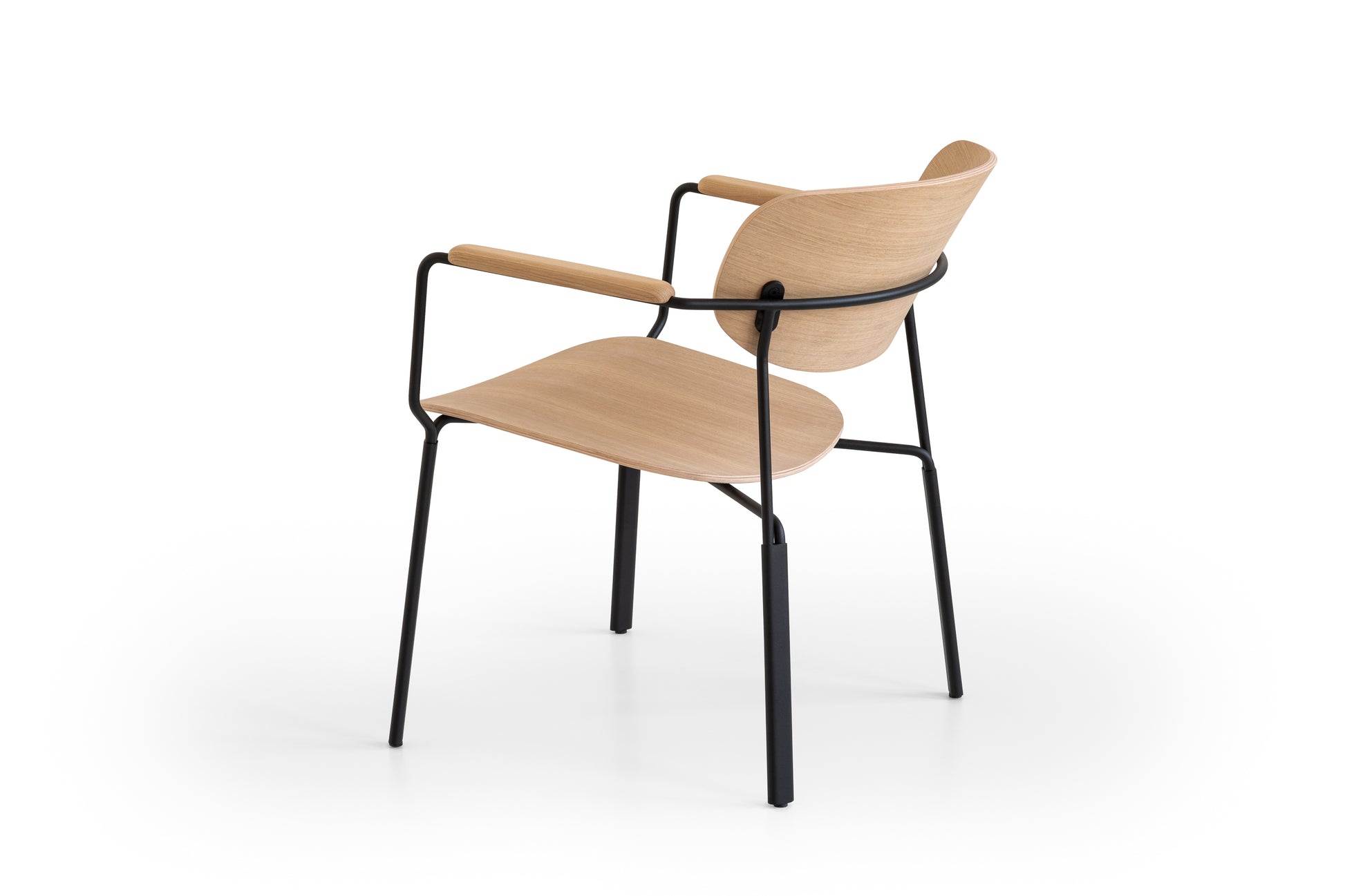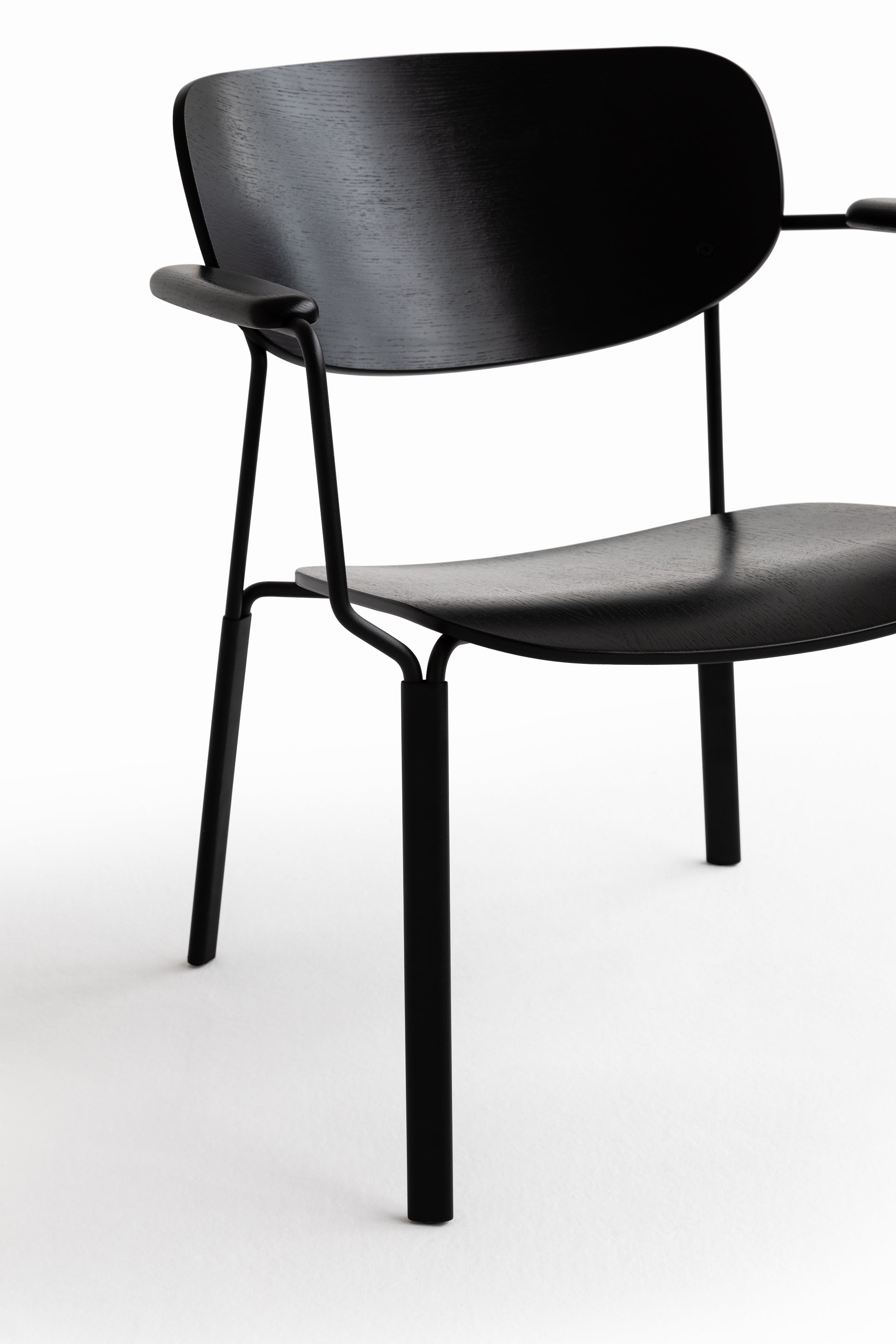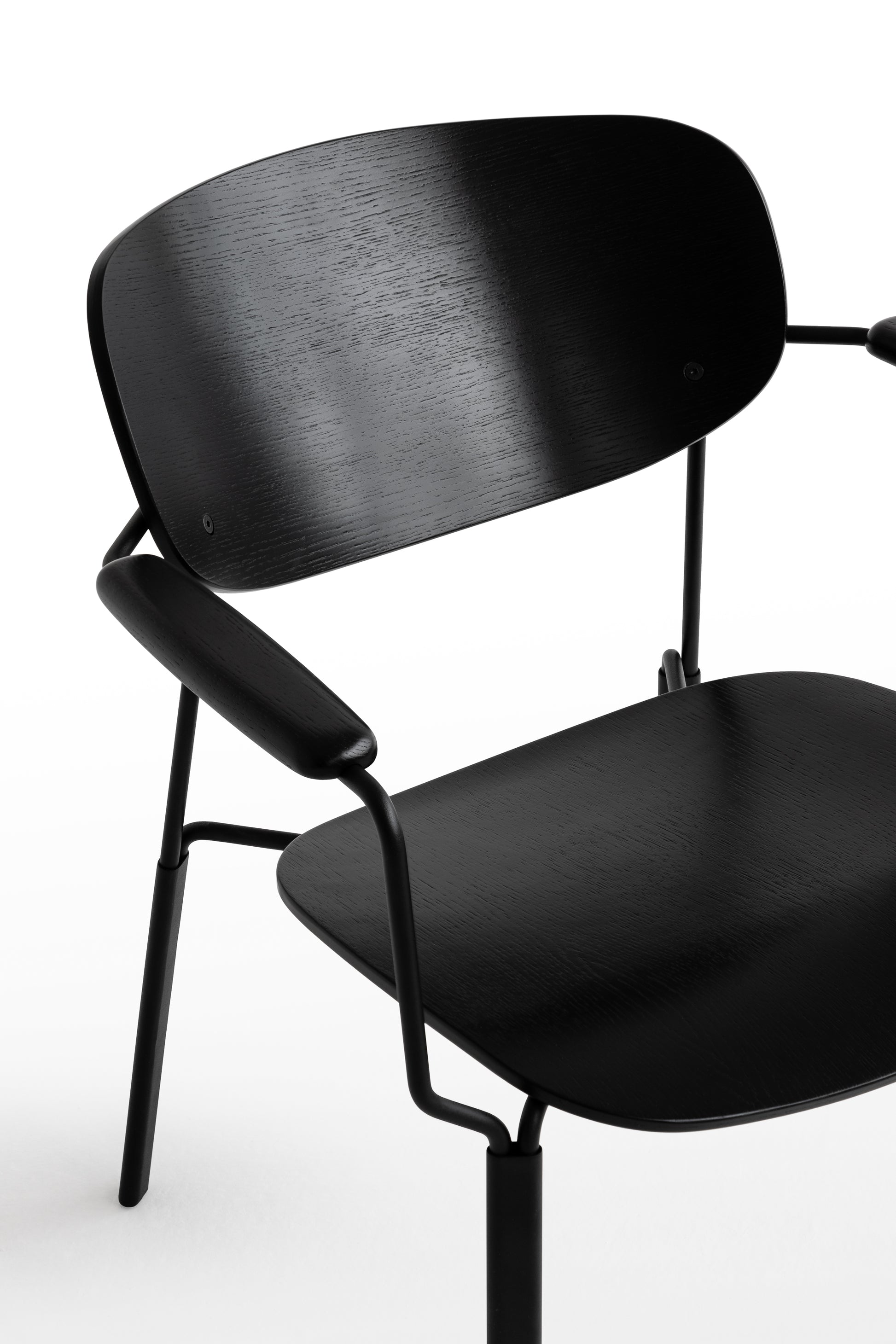 Die geschwungene Sitzschale, die integrierten Armlehnen und das feine Metallgestell ergeben zusammen einen Stuhl,
