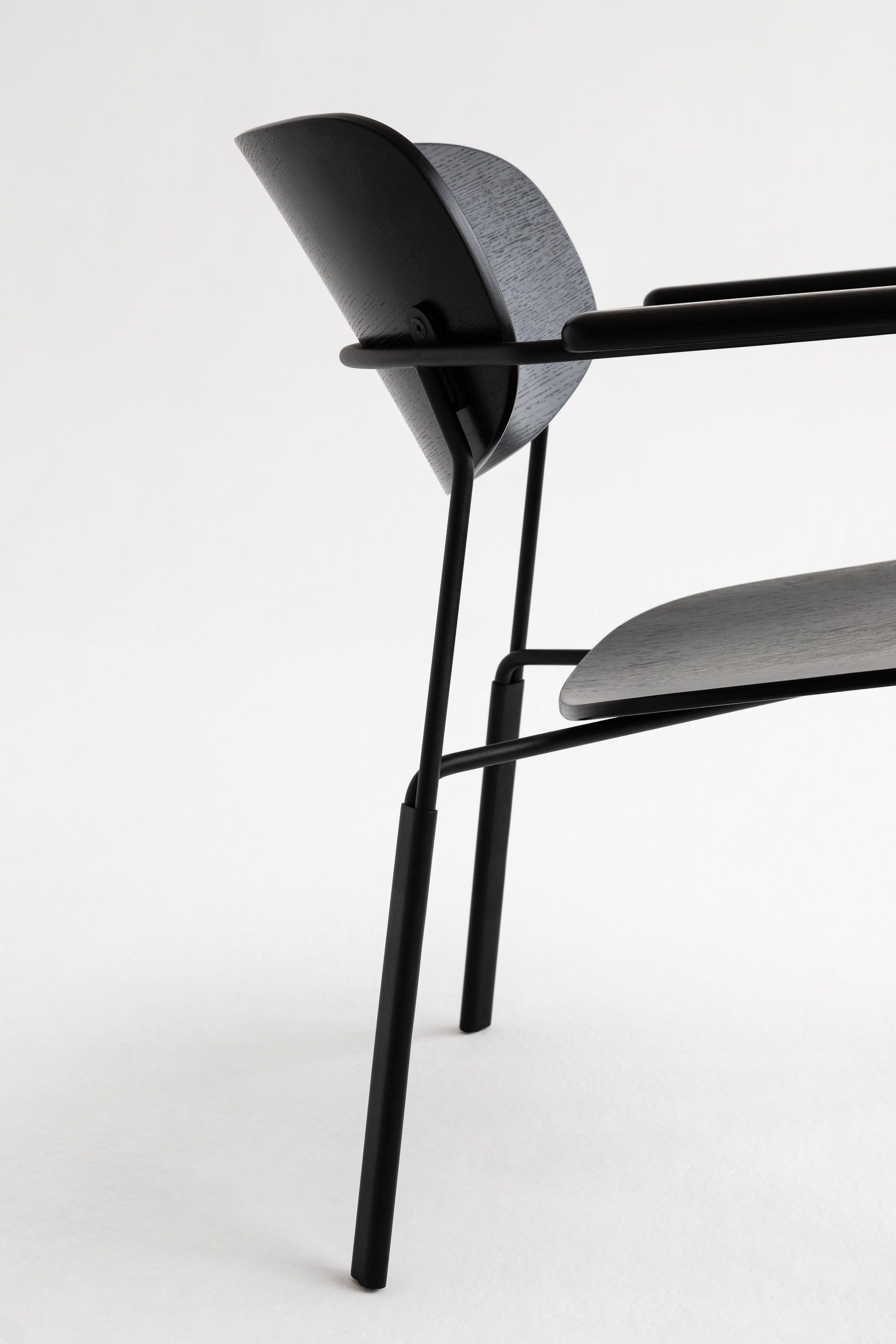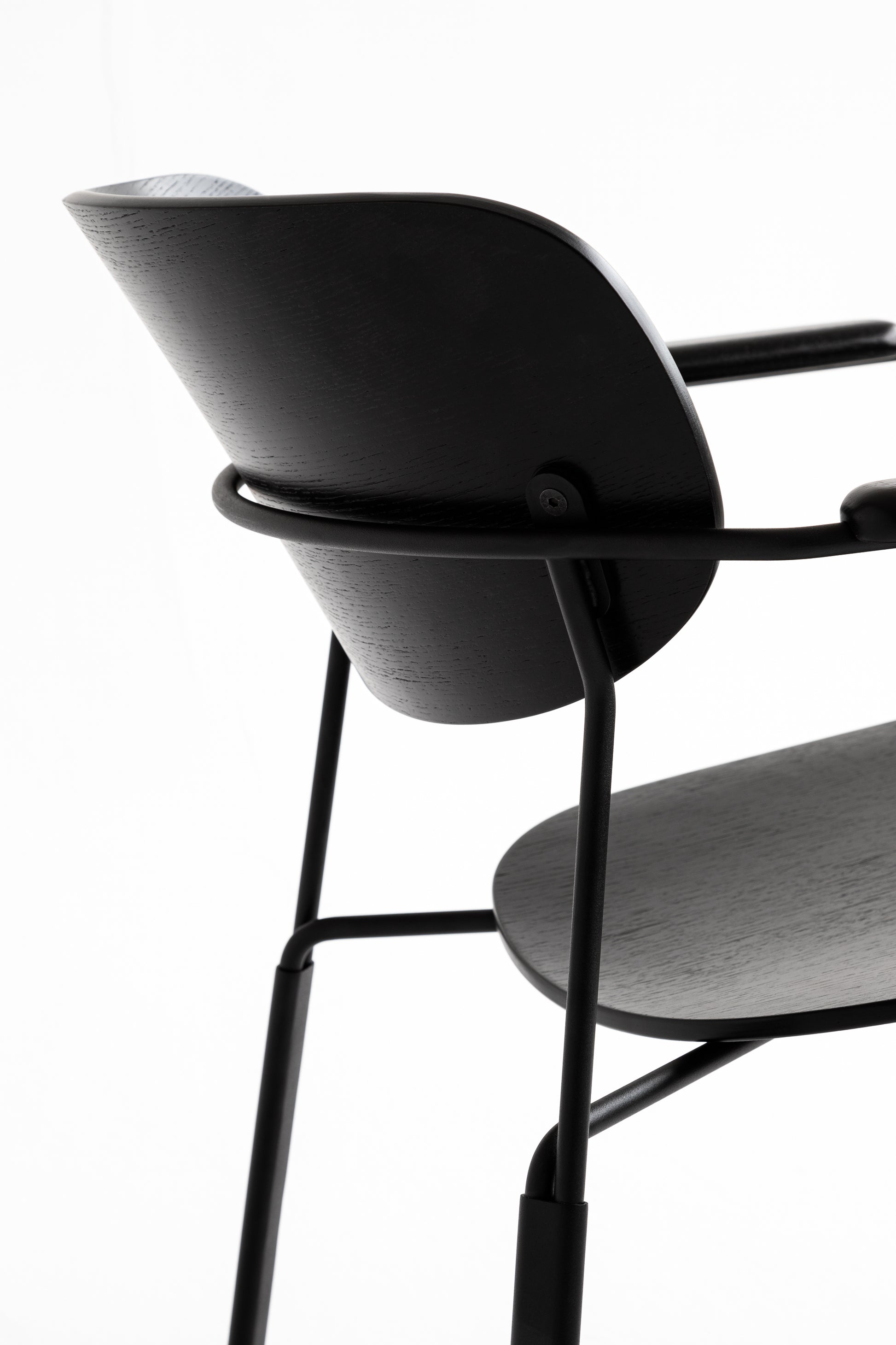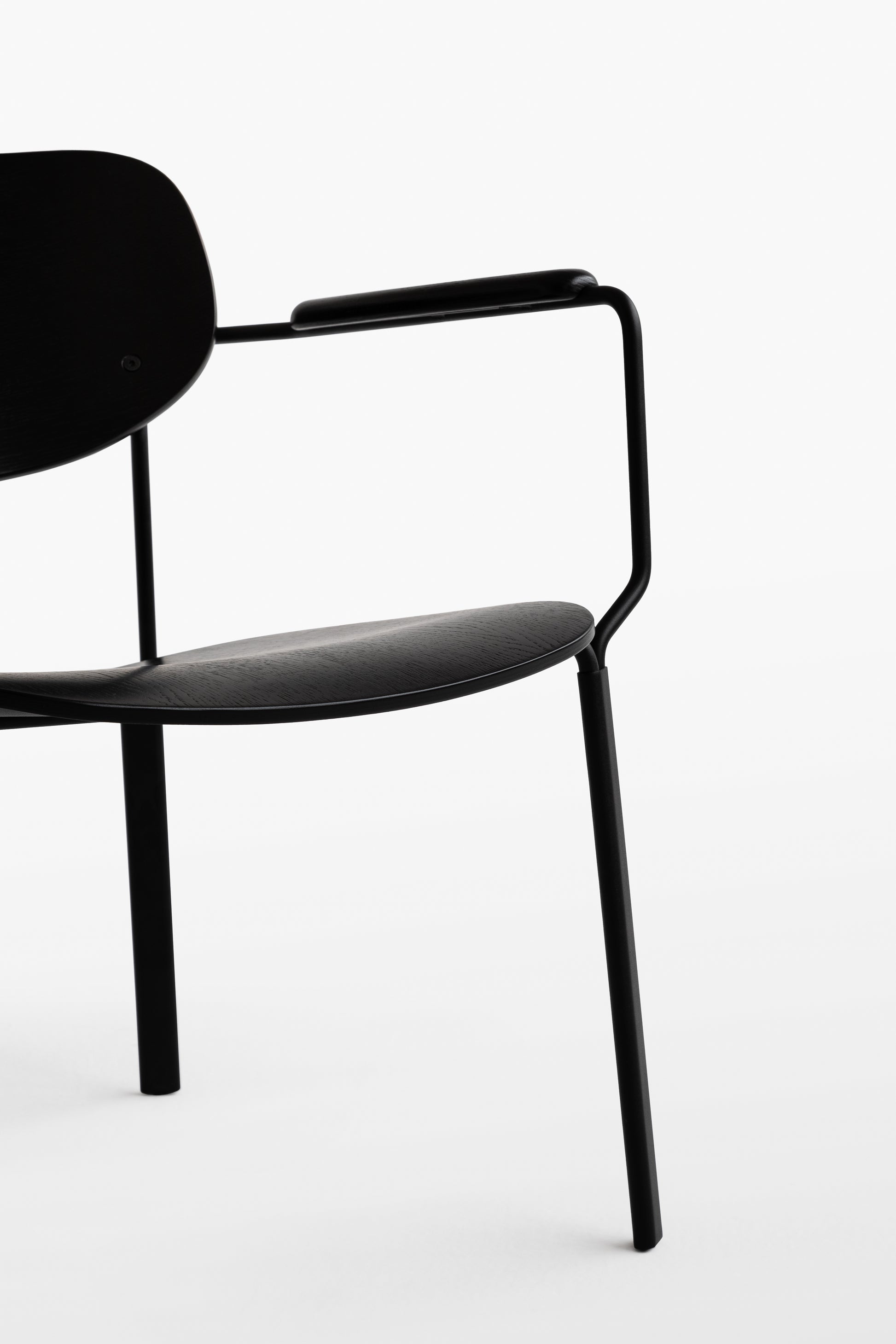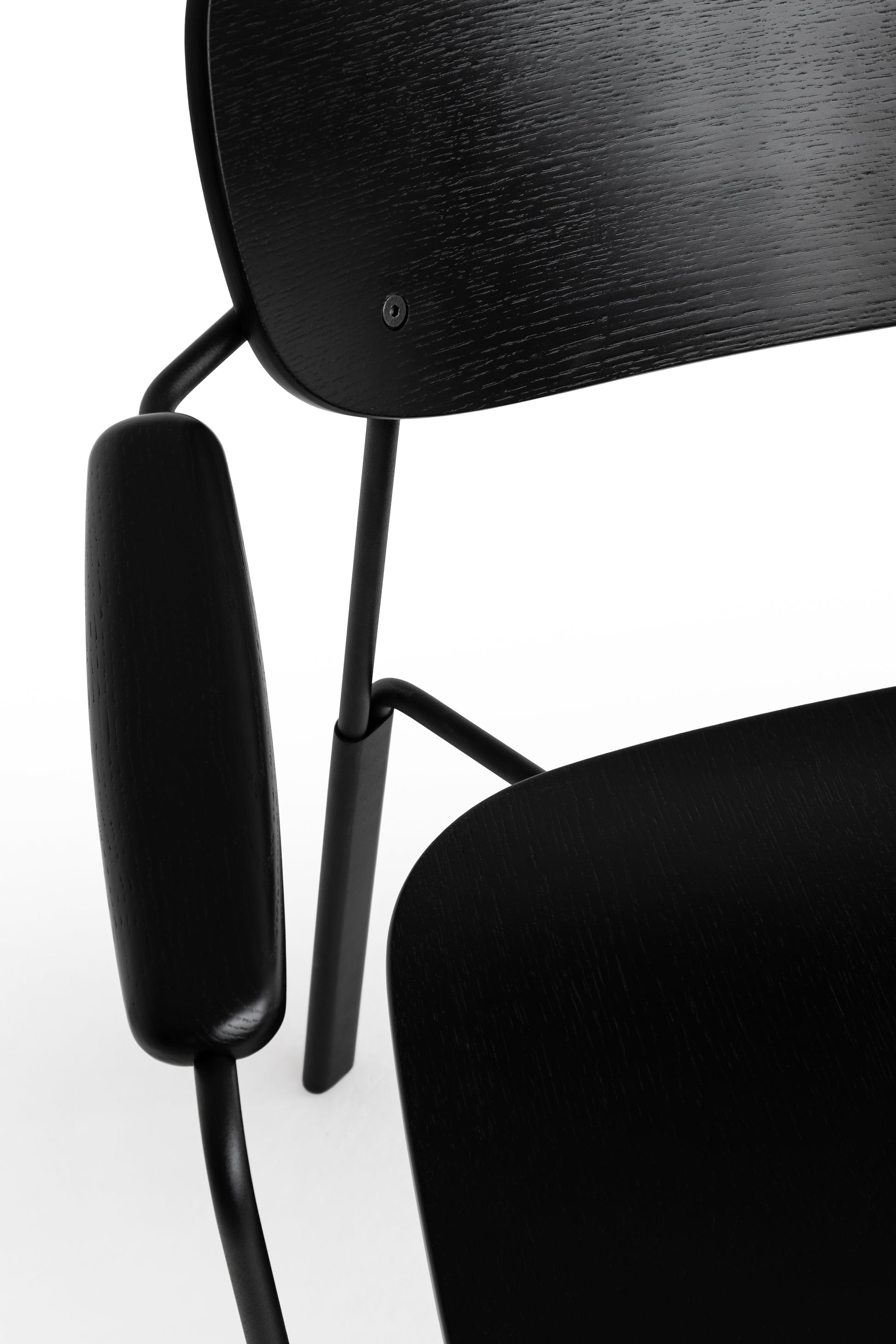 Die geschwungene Sitzschale, die integrierten Armlehnen und das feine Metallgestell ergeben zusammen einen Stuhl,