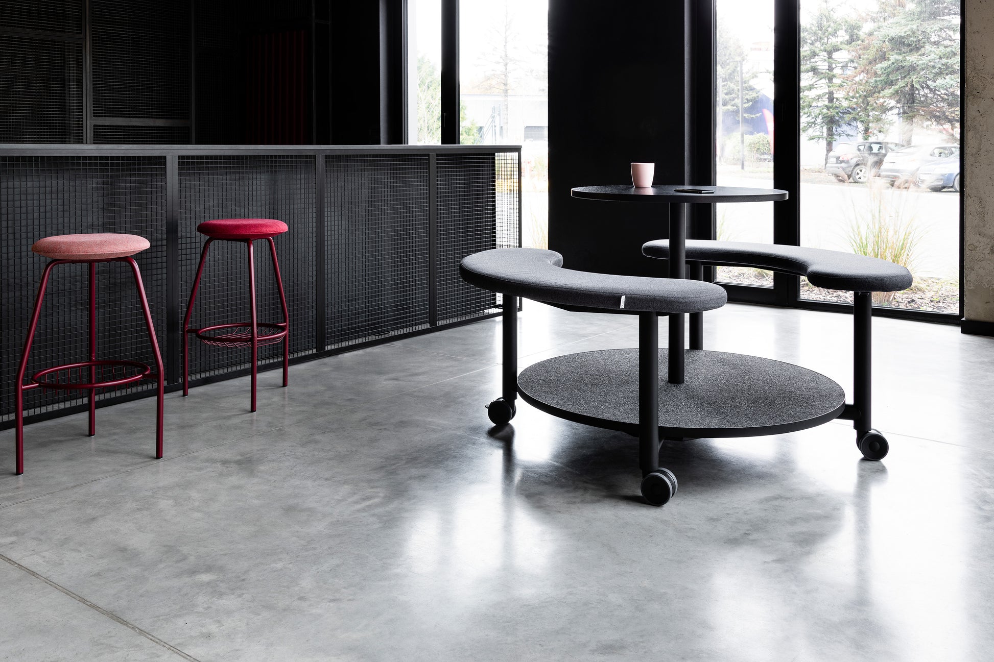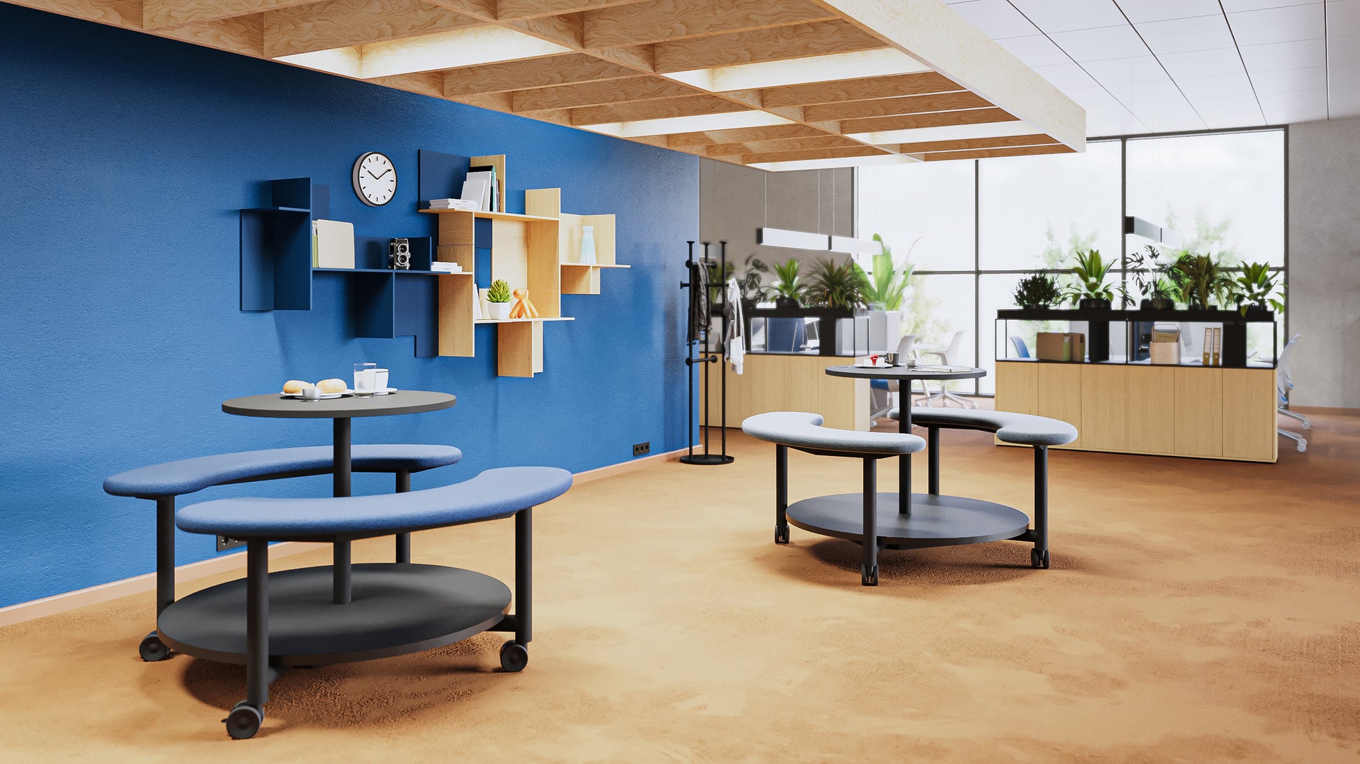 Mit Rollen bleibt die ganze Einheit mobil und kann je nach Bedarf im Raum verschoben werden – perfekt für flexible Open-Space-Konzepte.