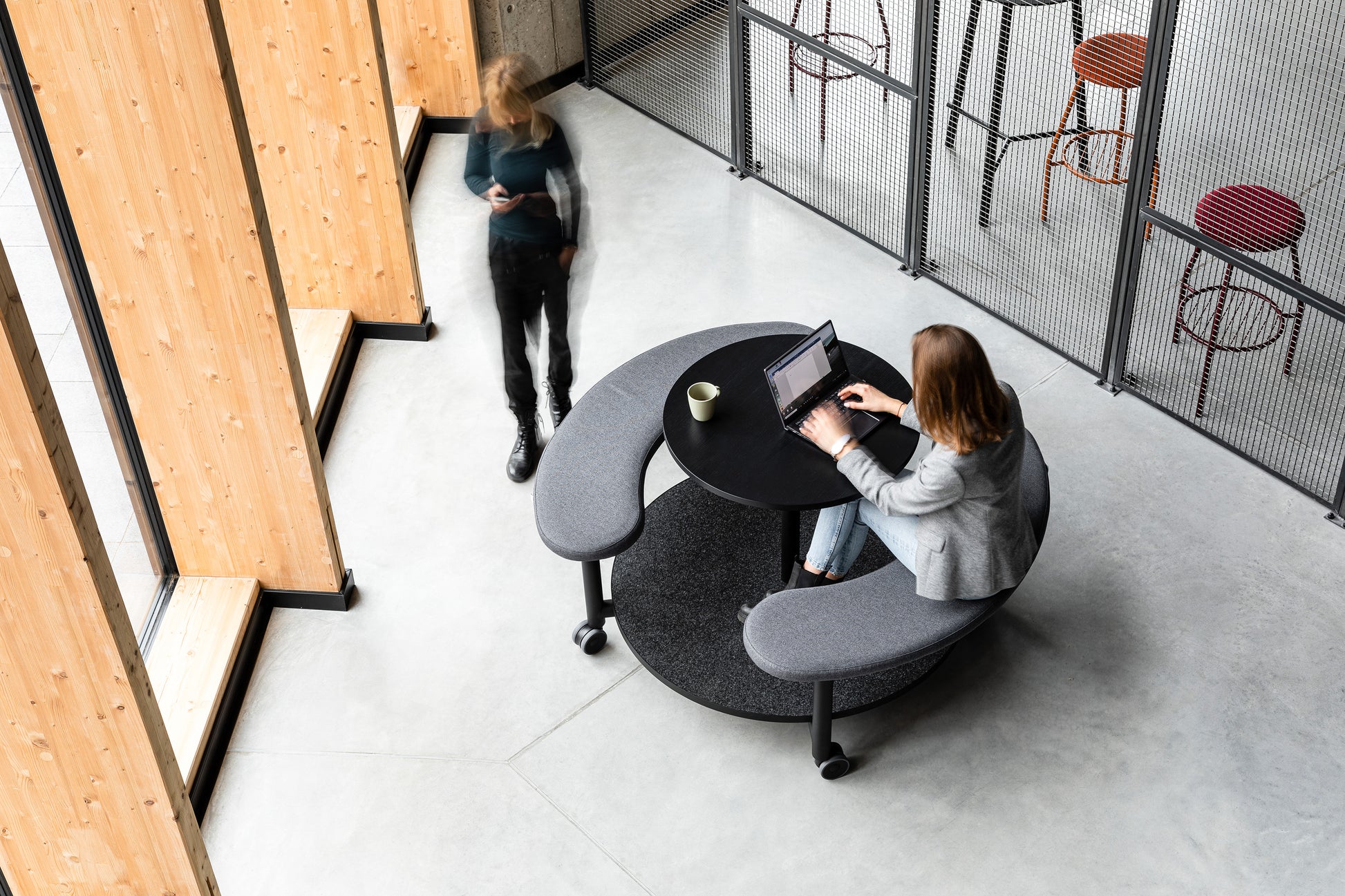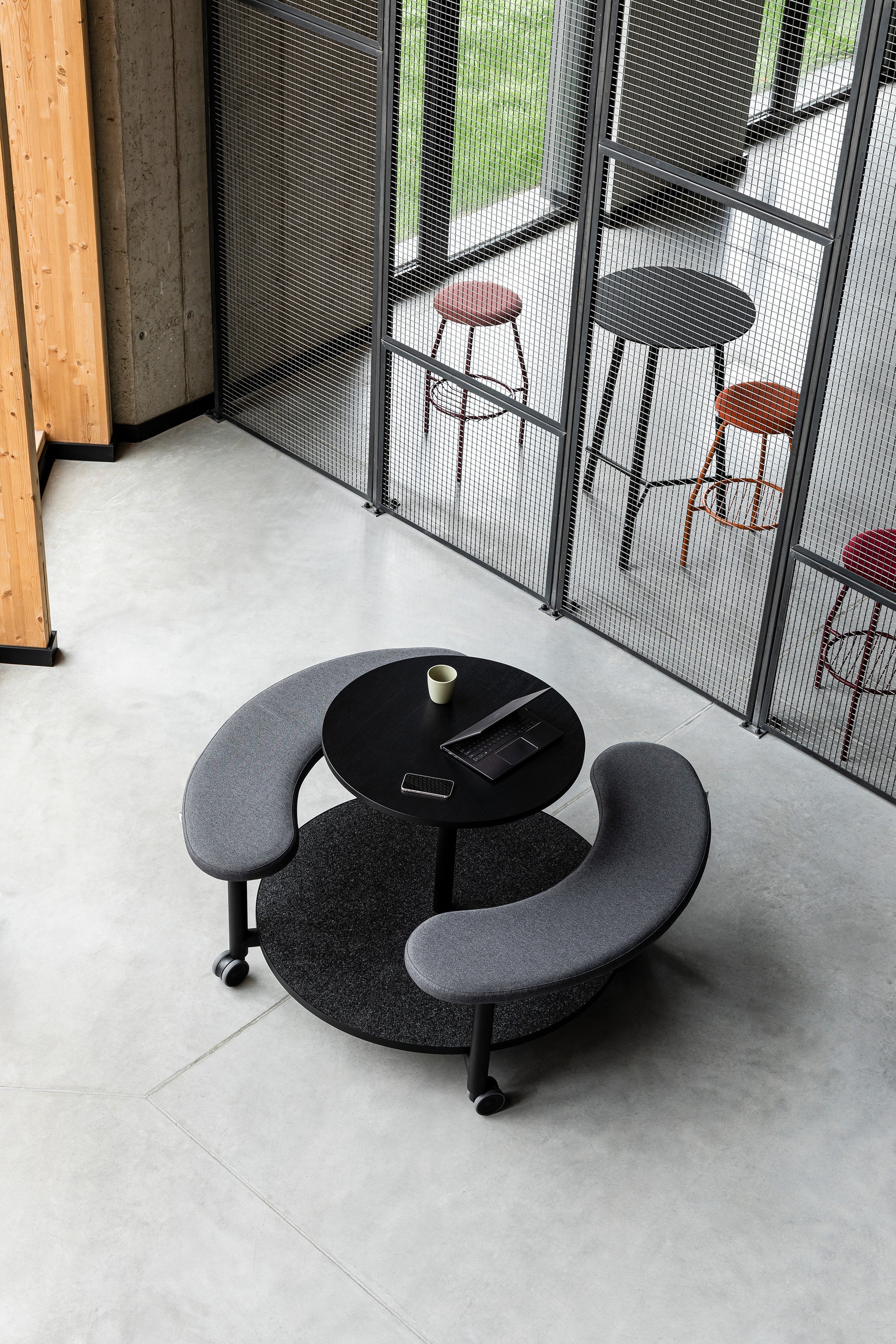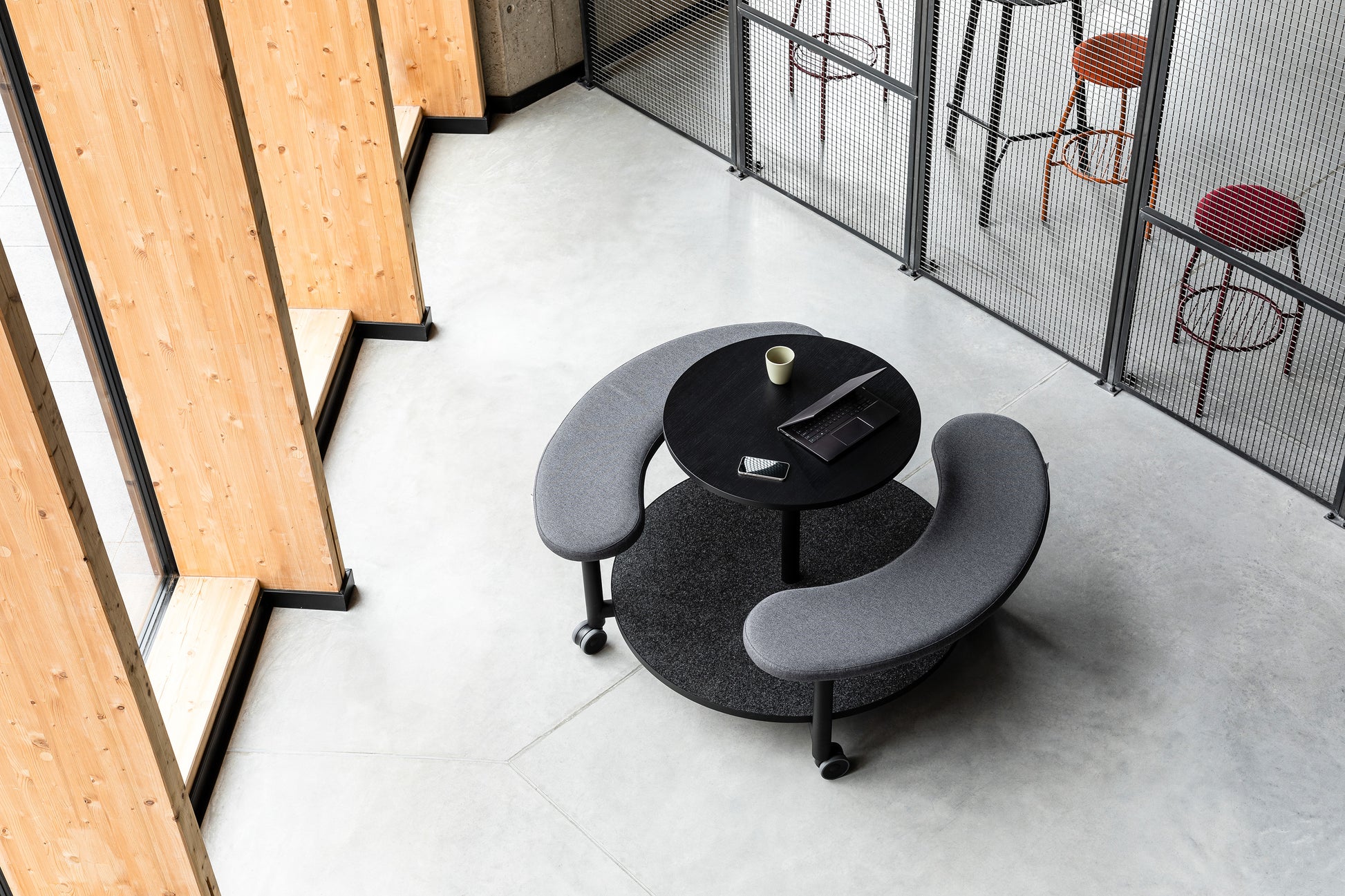 Als durchdachte Kombination aus Tisch und gepolsterter Bank bietet er einen bequemen Ort zum Sitzen, Arbeiten, Essen oder einfach zum Austausch mit Kolleginnen und Kollegen.